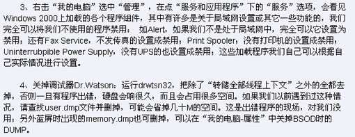 (3)再运行“添加→删除程序”,就会看见多出了个“添加/删除Windows组件”的选项(这样可以删除一些附件)。 2、打开“文件夹选项”,在“查看”标签里选中“显示所有文件和文件夹”,此时在我们安装Windows 2000下的区盘根目录下会出现Autoexec.bat和Config.sys两个文件,事实上这两个文件里面根本没有任何内容,可以将它们安全删除。  注意:各个加载程序后面都有说明,以及运行状态;选中了要禁用的程序,右击它选“属性”,然后单击停止,并将“启动类型”设置为“手动”或者“已禁用”就行了。 三、去掉文鼎字体 Windows 2000似乎与文鼎字体并不怎么兼容,如果我们在运行2000时总是安装不了新的软件,或者运行些程序总是出错,请把文鼎字体删除。 四、更好的“休眠”功能 页码:[1] [2] [3] [4] [5] 第3页、共5页 |