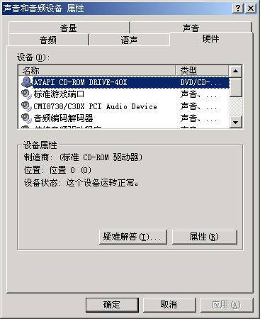 在“声音和音频设备属性”对话框中,单击“硬件”标签,打开“硬件”选项卡(图17)。在“设备”列表框中,用户可以查看到系统中安装的多媒体设备。在列表框中选择某个设备,然后单击“属性”按钮,可以打开该设备的属性对话框。