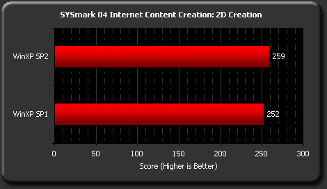 x 5.1 Macromedia Dreamweaver MX Macromedia Flash MX Microsoft Windows Media Encoder 9 Series Network Associates McAfee VirusScan 7.0 WinZip Computing WinZip 8.1 如果你平时经常使用上表的某些软件,那么可以睁大眼睛看看下面的测试结果了! 因为上面的应用软件运行的方式不完全一致,因此SYSMark根据下面的不同测试方案分别得出不同的测试结果。 例如,我们第一个看到的测试结果是3D Creation测试方案,该方案的测试过程如下:首先使用3ds max 5.1将一个3D 模型转换成一个位图文件,在转换的过程中,运行Dreamweaver MX制作网页,接着将一个3D动画转换成一个向量图格式的文件。 3D Creation的测试结果如下图所示:  由上图可见,装上SP2补丁的操作系统的成绩略高一些。SP2的优势会继续保持下去吗? 2D Creation测试方案:首先运行Premiere 6.5将几个电影片断和几个声音文件合成一个电影文件,并导出该文件;在生成新电影文件过程中,使用Photoshop 7.01打开一个图片文件,修改并保存文件。在电影文件到处成功后,再用After Effect 5.5进行编辑和产生特效功能。 页码:[1] [2] [3] [4] [5] [6] [7] 第3页、共7页 |