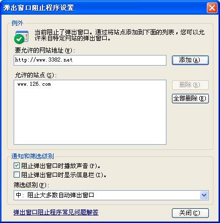 览网页,同时还可以发现工具栏下部多出了一个数量统计的信息栏。 虽然IE新增的这项功能能够自动拦截所有弹出的广告窗口,但是如果有些朋友需要欣赏一下广告怎么办呢?我们只须点击新增的数量统计信息栏,并且从弹出窗口中选择“临时允许弹出窗口”一项,这时IE会自动刷新当前页面,并临时取消对弹出窗口的屏蔽。 另外还有些站点是以弹出窗口形式提供软件下载或者是注册登录,对于这些站点可以先进行登录,点击信息栏之后选择“总是允许来自此站点的弹出窗口”,这样就不用每次繁琐地临时允许了。 提示:点击信息栏之后选择“设置→更多设置”命令激活弹出窗口阻止程序设置窗口,在此可以事先手工输入允许弹出窗口的网站地址(图5),从而减少后期设置的麻烦。  图 5 2.管理加载项 为了让上网冲浪更为便捷,很多朋友都为以前版本的IE安装了各种增强插件,但是多种插件有可能相互之间干扰导致IE无法正常运行。SP2中提供的插件管理中心能帮我们解决这类难题。 ①运行“工具→管理加载项”命令激活插件管理窗口页码:[1] [2] [3] [4] [5] [6] [7] [8] [9] 第5页、共9页 |
