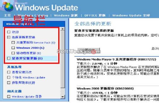 自身的语言版本情况,自动连接到微软升级网站的相应主页。如本人的操作系统是简体中文版,它联接的主页就是http://v4.windowsupdate. microsoft.com/zhcn/default.asp。点击本主页信息栏中的“查看以寻找更新”按纽(它用蓝色字体书写,左边有一个绿色背衬的白色箭头符号的方形图案),就可进入Windows关键更新、历史更新和微软认证的驱动更新网页,启用Windows Update远程自动检测功能,检测本地系统所需的全部更新。 Windows Update检测后的所需更新会在该页左边的导航栏内显示出来(如图一红线框所示)。  图 一 一般有三个项目:关键更新和Service Pack,Windows,驱动程序更新。“关键更新和Service Pack”是系统重大缺陷的补丁,若不更新,系统将有运行稳定或重大安全隐患;“Windows”是系统的历史更新补丁,主要是一些Direct插件、Windows Media Player 9系列补丁、多语言支持项目,它显示的内容会因操作系统的不同而有变化,如Windows 页码:[1] [2] [3] [4] [5] [6] 第3页、共6页 |