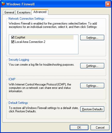 务”列表中被默认禁用。 对于在“高级”选项卡中选定的所有连接,所有在“例外”选项卡中启用的程序和服务都将启用。 “高级”选项卡 下图显示了“高级”选项卡。  “高级”选项卡包括下面几个部分: • 网络连接设置 • 安全日志 • ICMP • 默认设置 网络连接设置 在“网络连接设置”中,您可以: • 指定一组用于启用 Windows 防火墙的接口。如要启用,请选择网络连接名称旁边的复选框。如要禁用,请清除复选框。默认情况下,所有的网络连接都启用了 Windows 防火墙。如果某个网络连接没有出现在此列