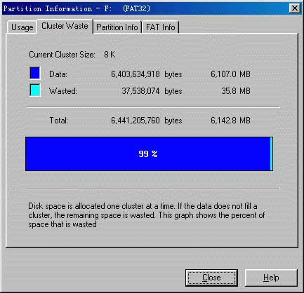可以最大化利用硬盘空间。 2. 利用Partition Magic调整簇大小 虽然在格式化硬盘的时候,系统会自动决定硬盘的簇大小,但这并不代表一定是最好的选择。若是想调整设置以取得更好的性能,就必须通过第三方软件来实现了,而大名鼎鼎的Partition Magic就是这样一款帮助用户找回原本属于自己硬盘空间的软件。 运行Partition Magic之后,程序会自动显示当前计算机中安装的硬盘以及相对应的分区。选择一个分区后,按下工具栏中的“Partition Information”按钮,或者在这个分区上右击鼠标并在弹出的菜单中选择“Info...”(分区属性)按钮来对这个分区信息进行查看。 选择【Cluster Waste】(浪费的簇)标签后,Partition Magic会动计算相应分区中浪费的簇容量,其中信息分别如下: Current Cluster Size(当前簇大小):就是指该分区目前所设定的簇大小; Data(数据):指得是目前已经存放在该分区中的数据; Wasted(浪费):在页码:[1] [2] [3] [4] [5] [6] [7] [8] [9] 第4页、共9页 |