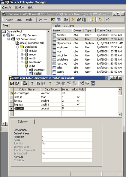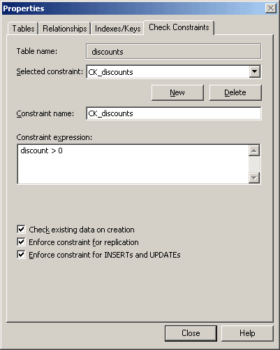 er>图A  在Enterprise Manager中操作约束条件 下面是相关选项的说明: Set Primary Key-将所选的列定为该表的主键。在图A中,discounttype区域是主键,其键名左边的黄色钥匙就是主键标志。 Relationships-确定所选列是另一个数据表的外键。 Check Constraints-为数据表创建check 约束条件,并且可以编辑和删除之前定义的约束条件。图B显示了在discount 列创建约束条件(图中的约束条件是discount值必须大于0)的情况。 图B  创建ch页码:[1] [2] [3] [4] [5] [6] 第4页、共6页 |