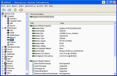 频相对比也能够知道CPU是否超频使用。另外,这里也可以查看到可以使用的内存条类型,按照提示的SDRAM或者DDR去购买,即便是菜鸟也不用担心买错。 3. 内存信息检测 在AIDA32左侧窗口点击“Memory”以及“SPD”之后,可以检测内存条的情况。其中“Memory”提供了物理内存和虚拟内存的大小、使用率等情况,而且程序还会给出一些提示信息来建议你优化系统。选择“SPD”之后,能够对内存条的颗粒进行更细致的检测,比如内存条的品牌、内存的速度、带宽以及所支持的CAS级别等信息(图2),如果商家告诉你内存是KingMax品牌的,但是检测识别为HY的话,则说明你遭遇J商了,那么,带上AIDA32找他去。  4. 显示系统信息检测 AIDA32不仅能够正确识别出显卡的类型,而且能够识别出显卡的主芯片和显存容量,假如遇到J商以次充好或者用其它品牌的显卡冒充的话,你就可以一语击破了。特别需要指出的是,针对所使用的显卡品牌,AIDA32提供了厂商网站和相应的驱动程序下载网站,因此如果你不小心丢失了显卡驱动程序也没有关系,就按照AIDA32提供的链接下载一个即可。 页码:[1] [2] [3] [4] [5] [6] 第3页、共6页 |