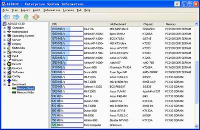 如果不小心遗忘了这些密码的话,那么下次安装时候就麻烦大了。不过AIDA32为我们提供了一个解决之道,点击“Software->Licenses”之后,就能够看见所有安装序列号的软件列表,同时也提供了每个产品序列号,这样就不怕没有序列号无法再次安装了吧,呵呵。 此外,AIDA32的软件检测功能还提供了事件查看器、计划任务查看、系统配置文件等功能,这些在Windows 2000/XP中都可以通过相应的程序实现,在此也就不多加介绍了。 BenchMark测试 在对自己的计算机进行了全方位的检测之后,AIDA32还内置了一个简化的BenchMark功能,直接选择AIDA32左侧窗口的“Benchmark”,即可对内存的读、写两个方面进行测试,但是为了获得最为准确的测试数值,在测试的时候可不要移动鼠标或者按下键盘。如图3所示,AIDA32还把最终测试的数值和十余款机器进行对比,这样自己机器的性能到底如何就一目了然了。以后,根据前面检测项目中的提示进行有针对性的升级,这样就可方便你把计算机性能提升档次了。