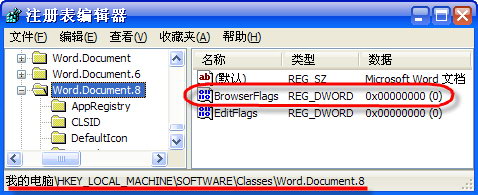 ument PowerPoint.Show.8 如果我们要修改Word文档的打开方式,,则在“HKEY_LOCAL_MACHINE\SOFTWARE\Classes\Word.Document.8”下新建一个名为“BrowserFlags”,类型为“REG_DWORD”的子键值,如果设置其值为“8”,则在独立的窗口中打开Word文档,否则在嵌入IE的Word窗口中打开文档。 注:Microsoft Excel 7.0 worksheet稍有不同,应设置BrowserFlags的值为“9”方可在独立的窗口中打开文档。  参考资料: MSDN:259970:In-Place Activating Document Servers in Internet Explorer MSDN:162059:How to configu页码:[1] [2] [3] [4] [5] 第4页、共5页 |