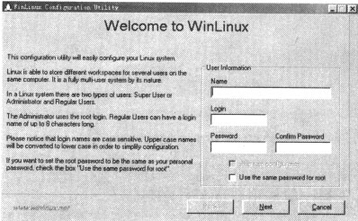 拟环境下面,我们可以进行正常的操作,包括安装文件,修改密码等,这样的环境已经足够一般用户学习*nix环境。但这还不够,下面介绍3个完整的嵌套系统,它们可以有自己的分区,自己的界面和自己的操作系统内核,而不仅只简单停留在Shell的模拟上。 Winlmnux2003的推出,使得Linux和Windows的整合又上了一个新的台阶。它己经完全属于一个Linux操作系统,但是可以在Windows环境下安装,不足的地方就是这个系统只支持Windows95/98/Me系统。 安装前,必须先注册,因此机器必须和Internet连接。 下面设置Winlinux的登录账户和密码,如图6所示。  图6 安装程序自动探测系统的配置情况,没有探测到的系统配置,可以在这里自行修改,如图7所。  图7 安装完毕后重新启动机器,第一次重启页码:[1] [2] [3] [4] [5] [6] [7] 第3页、共7页 |