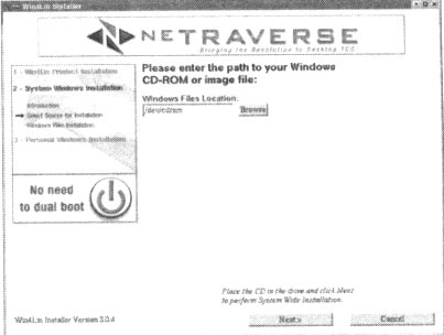 nux文件系统上,如图11所示。  图11 指定Windows文件的源拷贝目录,如图12所示。  图12 这时让选择WinSock还是NVNET,如果在局域网中,并且想访问局域网中的其他机器,请选择VNET,否则请选择WinSock方式。接着,开始安装Windows,这和正常的Windows安装没有什么区别。 安装完成后,在Linux桌面上会多出一个Win4Lin的图标,双击就可以进入Windows系统。系统运行的界面截图如图13所示。 页码:[1] [2] [3] [4] [5] [6] 第2页、共6页 |