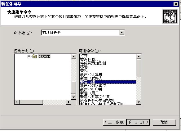 向导”被选中。然后点击“完成”如图8所示: 图8 (15)之后将启动“新任务向导”,点击“下一步”,然后选择“菜单命令”。点击“下一步”。 (16)在对话框中,我们可以为用户一个一个制定所需任务。在“命令源”处选择“树项目任务”,在控制台树中选中Office这个OU,在“可用命令”中选中“新建->组”然后点击“下一步”,如图9所示: 图9 (17)在对话框中,输入任务名为“新建一个用户组”,描述为“为Office 新建一个Group”,点击“下一步”后,为这个任务选择一个你喜欢的图标。如图10所示: 图页码:[1] [2] [3] [4] [5] 第2页、共5页 |