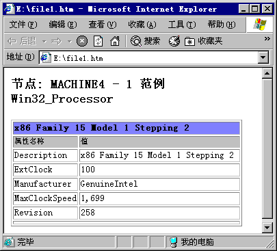 L样式文件既可以是自定义的,也可以是任何安装了WMIC的机器上\%systemroot%\system32\wbem文件夹下面的任意XSL文件。例如,利用csv.xsl样式文件可以把输出结果转换成CSV格式,利用htable.xsl样式可以构造出一个包含结果数据的表格。图三是在浏览器中打开的file1.htm文件。 wmic /node:MACHINE4 /output:e:\file1.htm cpu get description, maxclockspeed, extclock, manufacturer, revision /format:hform.xsl 图三 前面已经提到,Class命令加上Get动词的默认输出是HTML格式。因此,如果要把这类命令的输出结果保存到HTML文件,只需指定/output开关,不必加上/format开关。/record和/append全局开关也能