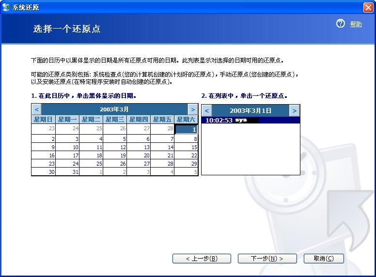 。 3.出现"还原点已创建"对话框,并显示创建的时间、还原点名称(描述),点击"主页",则进入图一所示主页面,点击"关闭"则关闭系统还原实用程序。 2)选择还原点进行系统还原的方法: 1.单击 开始->所有程序->附件->系统工具->系统还原 来打开系统还原程序,如图三,选择"恢复我的计算机到一个较早的时间"单选框,然后单击"下一步"继续。 2."选择一个还原点"对话框出现,如图四,由于系统会定时或在特定事件触发时自动创建还原点,所以,在左边的日历中,有还原点的日期会用粗体表示,点击一个用粗体表示的理想的日期,在右边的还原点列表中就会显示出所选择日期中的所有还原点描述,选择一个理想的还原点,点击"下一步"继续。 3."确认还原点选择"对话框出现,在这里系统用红色突出显示所选择的还原点,并提示关页码:[1] [2] [3] [4] [5] [6] 第4页、共6页 |