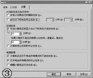 会导致关闭计算机的过程无法顺利完成。 空闲关机 以上的关机策略仅仅是有意识地设定关机时间,然而工作与生活中我们不会每次都特意设定关机时机,打瞌睡时我们会忘却这些,工作忙时我们会忽略这些,那么如何避免让电脑在空闲之时还苦苦等待呢?龙龙这里有一招看家本领。  在Windows 98桌面中右键点击鼠标,选择 “新建→快捷方式”选项,之后在快捷方式的命令行窗口中输入Rundll32.exe User.exe ExitWindows,并命名“Exit”保存。上述动作完成后打开“附件→系统工具”中的“计划任务”选项,并将桌面中的“Exit”快捷程序拖入“计划任务”窗口中。然后双击“计划任务”窗口中的“Exit”图标,在弹出的窗口中点选“设置”,然后选中“仅当计算机空闲至少达以下时间后才启动任务”并根据自身情况设定时间(图3)。 一切完成后,当你的计算机空闲时间达到你的设定时间后,计算机将执行Exit程序,自动关闭计算机。如果你在“计划任务”中选择了“每天”为设定单位,机器也会每天在你设置的时间自动关闭。对于反感复杂工作的用户,龙龙更推荐他们使用Shu页码:[1] [2] [3] [4] [5] [6] 第4页、共6页 |