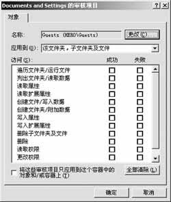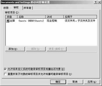 > 对文件和文件夹访问的审核,首先要求审核的对象必须位于NTFS分区之上,其次必须为对象访问事件设置审核策略。符合以上条件,就可以对特定的文件或文件夹进行审核,并且对哪些用户或组指定哪些类型的访问进行审核。 设置的步骤如下: 在所选择的文件或文件夹的属性窗口的“安全”页面上,点击“高级”按钮; 在“审核”页面上,点击“添加”按钮,选择想对文件或文件夹访问进行审核的用户,单击“确定”;  图2 审核项目 在“审核项目”对话框中,为想要审核的事件选择“成功”或是“失败”复选框,选择完成后确定。(见图2)。  图3 访问控制设置 返回到“访问控制设置”对话框。默认情况下,对父文件夹所做的审核更改将应用于其所包含子文件夹和文件。如果不想将父文件夹所进行的审核更改应用到当前所选择的文件或文件夹,清空检查框“允许将来自父系的可继承审核项目传播给该对象”即可。(见图3)。 确认并返回。页码:[1] [2] [3] [4] [5] [6] 第3页、共6页 |