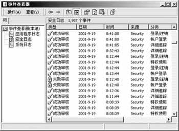 。 2.在事件查看器窗口的控制台树选择“安全日志”。在右边的窗格显示日志条目的列表,以及每一条目的摘要信息,包括日期、事件、来源、分类、事件、用户和计算机名。成功的事件前显示一钥匙图标,而失败的事件则显示锁的图标。(见图5)。  图5 事件查看器 3.如果想查看某一条目的详细信息,双击选择的条目;或是选择一条目后,点击“操作”菜单的“属性”项。 4.如果要查看某一指定类型的事件,或某一时间段发生的事件,或某一用户的事件,就需要运用事件查看器的查找功能。具体操作如下: 确认控制树中当前选定的项目是“安全日志”,点击查看菜单的“查找”项。 在查找窗口中,选择或输入相应的条件,点击“查找下一个”按钮,符合条件的事件就会在事件查看器的事件列表窗格中反显出来。 5.如果想在事件查看器的事件列表窗格中只列出符合相应条件的事件,这时要用到筛选功能。具体操作如下: 确认控制树中当前选定的项目是“安全日志”,点击“查看”→“筛选”。 在“筛选器”页面中,选择或输入相应的条页码:[1] [2] [3] [4] [5] [6] 第5页、共6页 |