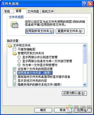 是微软Windows域的一部分,默认情况下所有的文件共享是可以从任何地方访问的。然而,在现实世界中,我们只想将共享提供给特定的、授权的用户。同样地,简单文件共享只是无一例外地允共享提供给所有用户,这并不是共享文件系统的初衷。默认情况下,在Windows XP的专业版和家用版中,这种功能是活动的。不过,它无法在家用版中禁用。在专业版中,可通过这种方法关闭之:打开“我的电脑”/“工具”菜单/“文件夹选项”/“查看”选项卡,取消选择“高级设置”下的“使用简单文件共享(推荐)”,如图: