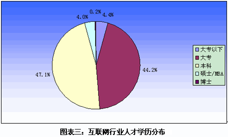 长期以来,互联网行业的从业人员整体呈现了高学历、年轻化的特点。根据中华英才网的调查,互联网行业受访者中,大专学历的比例占到44.2%,本科学历的比例占到47.1%,硕士以上学历占到4.2%。