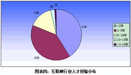 工作经验短缺是互联网行业人才市场的重要问题之一。根据中华英才网调查报告,在互联网行业从业人员当中,工作经验在不足5年的人员所占比重较大,5年以上工作经验的人群所占比重相对较小。其中,工作经验小于2年的占总受访人数的41%,工作经验2-5年的占40%,工作经验高于5年的占总受访人数的比例不足20%。