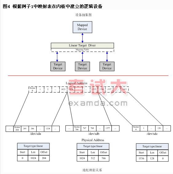 当用户空间根据映射表下达创建逻辑设备命令后,device mapper在内核中就根据传入的参数和映射关系建立逻辑地址到物理地址的映射关系。根据映射表例子1中的映射关系建立的设备如图4所示,图中的下半部分就抽象地描绘出了按照该映射表在内核中建立的逻辑地址到物理地址的映射关系。