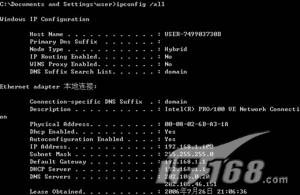 关于MAC地址网卡数据库可以在第一次装系统的时候进行记录,将网吧座位号与MAC地址等信息做一个对应表格。查看MAC地址的方法是通过“开始->运行”,进入命令提示窗口,然后输入ipconfig /all。在physical address的右边就是相应网卡的MAC地址。(如图1)