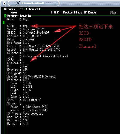 。如图十五所示。有些WLAN从安全方面考试,隐藏了SSID或屏蔽SSID广播,这样做的话的确能够防止使用Netstumbler来扫描,但碰上Kismet就毫无办法了,它可轻易地检测到隐藏的SSID。Kismet能够比Netstumbler捕捉到更多的网络信息,能够通过跟踪AP及与之相连接的客户端之间的会话而发现某个AP的SSID。