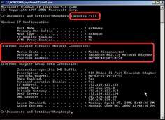 第三步就是记录下Target机器的MAC地址。一旦成功连接到网络上,就把被攻击的Target计算机的MAC地址记录下来。方法有两种,一是打开一个命令提示符窗口并输入ipconfig/all命令也可看到这个MAC地址,这个窗口的内容如下图七所示(无线网卡的MAC地址信息已高亮度显示)。