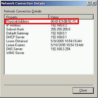 线连接状态”窗口来得到这个MAC地址,单击“支持”按钮,然后单击“详细信息”,这个MAC地址就显示在窗口顶端的右边(如图八所示),当然,不同的机器显示的名称可能不尽相同,另外的计算机显示的就可能如“物理地址”这一类的描述信息了。在这个窗口的信息,组成MAC地址的字母和数字被短划线分隔,短划线的目的只是使这些字符看得更清楚,但实际的MAC地址是没有这些短划线的。