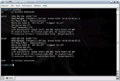 在这里,开始做其他任何其他的事情之前,先要确认我们机器上的无线网卡能够通过Auditor的验证。单击Command Line图标以打开一个命令行窗口,然后输入iwconfig命令,在Auditor显示出的信息中,你会看到有关于“Wlan0”的信息,它是Auditor为基于PRISM芯片的卡确定的一个名称,如果用来操作攻击的笔记本的屏幕显示如图十一所示的窗口,则表明Auditor已检测到了无线网卡,现在就可以开始下一步工作了。对于另外一台笔记本,也进行同样的步骤,重复这一操作。