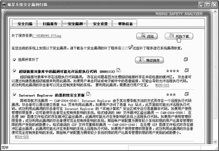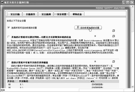 细描述信息,并且还建议用户如何进行修复。 用户清楚地了解到本地系统所存在的系统隐患。有问题当然要解决,修复这些系统隐患非常简单。要修复安全漏洞项目,只要在“安全漏洞”标签页中点击“开始下载”按钮(图2),下载和安装本地系统所需要的补丁修复程序即可,这样就修复了Windows系统本身存在的系统隐患。  图2 而对于用户不安全设置项目,其中有一部分,瑞星安全漏洞扫描工具可以自动修复。在“安全设置”标签页中,点击“自动修复选择的设置”按钮(图3),完成这部分项目的修复。剩下的项目当然就需要手工修复了,其实手工修复也很简单,用户根据每个待修复项目的描述和提示信息,可以很顺利地完成手工修复。  图3 通过以上自检和修复操作后,本地系统的系统隐患就被修复了,这样Windows系统就更加安全。 注意:杀毒软件对Windows系统隐患进行自检和修复比较简页码:[1] [2] [3] [4] [5] [6] [7] 第4页、共7页 |