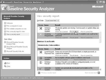 t Details”链接,在弹出的安全漏洞修复窗口中列出所有的漏洞项目,下面只要逐一点击右侧的“下载”图标,下载相应的补丁修复程序安装后就可完成安全漏洞的修复。  图5 对于不安全设置项目的修复,用户只能根据具体项目提示信息,进行手工修复,虽然MBSA手工修复较为麻烦,但它的安全设置部分自检功能更为强大,能够检测出比杀毒软件更多的不安全设置项目,如Windows各项系统服务的检测、Windows防火墙开启情况等。 如果是对局域网中多台机器进行自检,在MBSA主窗口中点击“Pick multiple computer to scan”链接,在“IP address range”栏中输入要扫描的网段,其它的操作同单机自检是相同的,这里就不赘述了。 MBSA2.0下载地址:http://www.microsoft.com/downloads/details.aspx?FamilyId=4B4ABA06-B5F9-4DAD-BE9D-7B51EC2E5AC9&displaylang=en 注意:MBSA工具虽然自检功能强大页码:[1] [2] [3] [4] [5] [6] [7] 第6页、共7页 |