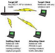 打开一个Windows的命令提示符窗口,知道输入相关命令和了解关于Windows网络属性窗口的相关内容。这就是基本的要求,要不然怎么可称之为菜鸟都可学会的方法呢。 1、组建实验环境 开始之前,我们的第一步就是要组建一个实验环境,你不可能拿别人的网络来玩你的破解吧,这样做既违反了法律也是一种不道德的行为噢。搭建一个实验环境下的无线网络平台,则无线AP是少不了的,另外,三台带有无线网卡的笔记本(使用有无线网卡的台式机也可以)组成的简单网络就可满足要求了。组成的网络拓扑如下图四所示。  图四:组建一个实验环境 在图四所示的网络中,无线AP的选用,我们使用的是一个Netgear的产品,型号为WGT624v2,它在以后充当被攻击目标的角色,在以后就称它为目标AP。在所使用的三台机器中,一台是作为被攻击目标的客户端机器,暂且称之为“Target”;另外两台笔记本一台执行主动攻击,促使网络流量的产生,以便足够多的数据包有比较短的时间内能够被捕捉到,称这台机器为“Attack”;剩下的那台笔记本就是用来嗅探页码:[1] [2] [3] [4] [5] [6] [7] [8] [9] 第5页、共9页 |