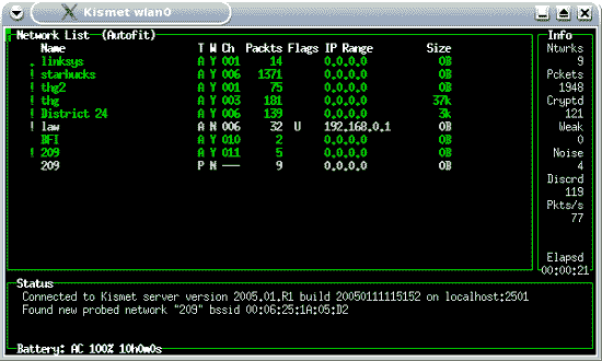 捉下来的数据包到不同的文件中。  图十四:在Kismet中指定文件的存放位置 当Kismet开始运行时,它将会显示这个区域内它找到的所有的无线局域网,“Name”那一列中所显示出来的内容就是哪一个WLAN中AP的SSID值,那当然开始设定的目标WLAN也应该包含中其中(Name下值为starbucks的那一行),在这一行中,CH列的值(AP所使用的频道)应该与开始所记下的相同。在窗口的最右边显示的信息是Kismet发现的WLAN的数目,已被捕捉下来了的数据包、已加密了的数据包的数目等等。如下图十五所示。如果Kismet发现了许多相邻的Access Point,你应把这个实验环境搬得离这些AP更远一些,或者把与你网上相连接的任何高增益天线断开。 甚至当目标计算机已关闭时,Kismet也正可从我们的目标AP中检测到数据包,这是因为目标AP在不停地发出“beacons”,它将告之拥有无线网卡的计算机有一个AP在此范围内,我们可以这样想像,这台AP宣布,“我的名字是XXXXX,请大家与我连接。”  图十五:Kismet显示的内容 默认的Kismet是运行在“autofit”模式下的,它显示的内容杂乱无章的,我们可以通过排序把AP按任何有意义有顺序来重新排列,按下“s”键到“Sort”菜单,在这页码:[1] [2] [3] [4] [5] [6] [7] 第2页、共7页 |