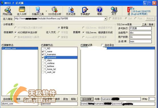 大学主页,浏览了一下,估计可以利用的漏洞不是很多,而且应该也没张三的个人信息,就在一筹莫展的时候,随便在www.google.com上搜索其所在中学名称,居然发现其所在的中学也已经有了自己的网站,打开其主页,发现新闻文章发布系统是采用asp系统,心中大喜,可能存在sql注入,再看其主页上居然还有一个自己学校建设的校友录版块,而且一看就知道肯定是采用网上那些免费的校友录程序的,看来此网站能够拿下的几率已经非常大了,等下就只需要确定张三是否在这个校友录上有注册,打开校友录中张三的中学班级,成员名单中显示他已经注册并登陆过,好,已经选顶了突破口,只要能够拿到这个网站的数据库,那么就可以拿到张三的密码,如果此密码和其在163.net上的邮箱密码一致,那么就大功告成,如果不同,那么也可以得到进一步信息。 先看首页的新闻系统,使用asp程序,随便打开一条新闻http://www.***.net/include/shownews.asp?id=453,在URL后面添加 and 1=1,居然没有报错,显然存在sql注入,拿出NBSI2,进行扫描,扫描结果如下:  图三页码:[1] [2] [3] [4] [5] [6] [7] [8] 第5页、共8页 |