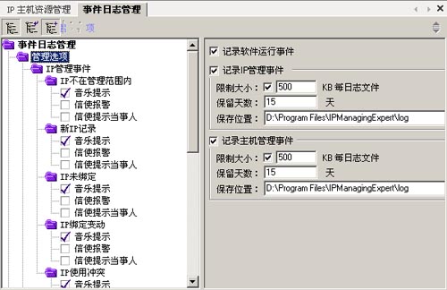 击其中的“本机管理”标签,然后在该标签选项下双击“事件日志”,在其后出现的事件日志管理资源列表界面中,选中“管理选项”,打开如图5所示的设置界面;  在该界面中,你可以选中“记录IP管理事件”选项和“记录主机管理事件”选项,同时在“保存位置”设置项处,指定好日志文件的保存路径,并指定好日志文件的保留天数,这样的话局域网中任何一台工作站的开机操作、关机操作、上网操作、IP冲突情况、IP地址擅自更改等事件,都能被实时地查看发现,而且每个事件都有详细的记录和不同的提示告警方式。