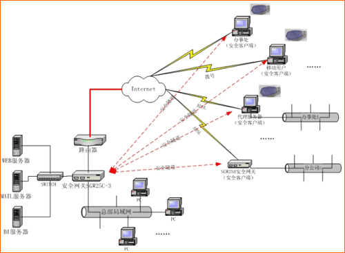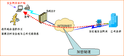 全网关,该安全网关支持ADSL接入,加密吞吐率可达到6Mbps,完全可以满足ADSL接入的要求,另外有防火墙模块,可以做到基于状态检测的访问控制。 分部和总部整体网络结构示意图如下:  在上图中,在internet和intranet接口处使用的安达通公司研制的“安全网关”SGW25C就彻底地解决了上述问题。分支机构及其出差员工只要通过本地ISP(如:163)拨号接入internet ,然后利用安装在其他机器上的“安全网关客户端”软件,就可以安全透明地通过与安全网关构成的加密隧道从internet上安全接入企业的内网,如下图所示: 图3 “安全网关客户端”使用示  基于上述原因,在该方案中建议可以省去中心机方中的页码:[1] [2] [3] [4] [5] 第4页、共5页 |