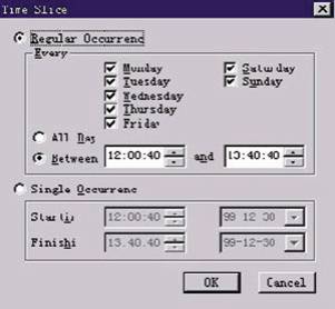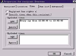 be assumed" 表示允许系统授权的用户使用本权限访问该服务功能; "User must be authentication"表示用户必须经过口令确认后才使用本权限访问该服务功能,如果要定义一个特殊的访问用户,请选择该选项。 选择TIME页,如图2所示,选择 "Sepecify times ..... ",指定用户可以服务的时间(Included Times)与不可以访问的权限(Excluded Times)。  下面就可以访问的时间设置举例说明,不可以访问的权限设置类推。单击图2中的Add按钮,如图3所示。  如果访问时间有规律,请选择Regular Occurrence (通用规则);如果要指定某段日期内访问的页码:[1] [2] [3] [4] [5] 第3页、共5页 |