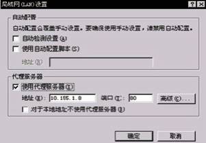 域网中一个客户端,运行IE5.0,点击菜单中的"工具|Internet|连接|局域网设置",如图4所示。  选择使用代理服务器,在地址和端口框中输入Wingate 服务器的IP地址及WWW Proxy Service服务的端口号。 完成IE设置后,在IE地址栏中输入域名,如果时间段不在允许的时间内,IE会自动调用Wingate 的Java Applet 的口令认证界面,如果输入的用户口令正确则可以浏览,同时将Java Applet 最小化,保持口令认证的连接,以便在打开下一个IE窗口时,不必再进行用户确认。 经过上述设置,就可以在公司局域网中实现用Wingate上Internet 的权限控制。另外您也可以设置用户组,实现某个用户组具有特殊的上网权限,有兴趣的读者可以试验一下。