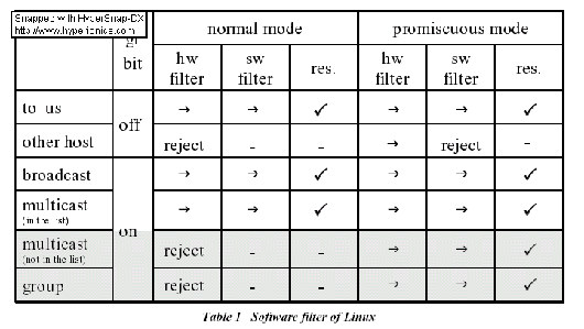 if (in_dev == NULL arp->ar_hln != dev->addr_len ' ' dev->flags & IFF_NOARP skb->pkt_type == PACKET_OTHERHOST skb->pkt_type == PACKET_LOOPBACK arp->ar_pln != 4) goto out; Linux内核的ARP模块拒绝所有OTHERHOST类型的分组。接着,ARP模块将处理广播、多投点和TO_US类型的分组。表1综合了硬件过滤器和软件过滤器对各种ARP分组的过滤处理,1说明:hw(hardware)、sw(software)、res.(response)、gr(group)。  下面,后我们将对这六硬件地址的分组进行详细描述: TO_US 网卡在正常模式下,所有地址为TO_US的分组都能够通过精简过滤器和软件过滤器。因此,不管网卡是否处于混杂模式(promiscuous mode页码:[1] [2] [3] [4] [5] [6] [7] [8] [9] 第8页、共9页 |