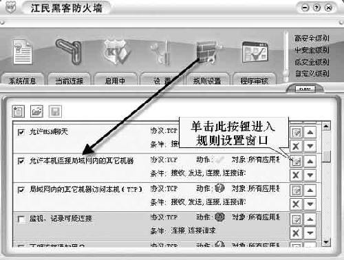 72.22.1.2~172.22.1.253,现在只要将起止IP地址输入,点击“确定”按钮使设置生效之后,在这个区段内的所有IP就都可以正常访问草莓的电脑了。 果冻提示 其实我们可以不将该网段的所有IP地址囊括进来,大家可以根据自己所在局域网的实际情况来确定IP的范围。 江民黑客防火墙 在这款防火墙的主界面上点击“IP规则设置”按钮,弹出IP规则列表。在这个IP规则列表中,可找到和局域网有关的两条IP规则:“允许本机连接局域网内的其它机器”、“局域网内的其它机器访问本机(TCP)”(图3)。  图3 如果要修改“局域网内的其它机器访问本机(TCP)”规则,可点击该规则所对应的编辑按钮,打开“反黑王规则设定”对话框,在其中的“对方IP地址”下拉列表中选择“地址范围”,并将本局域网的网段添加进来即可。如果你真的不希望被网内的其他用户访问,也可以在“局域网内的其它机器访问本机”这条规则内进行设置。 McAfee防火墙 在McAfee防火墙安装页码:[1] [2] [3] [4] [5] [6] 第3页、共6页 |