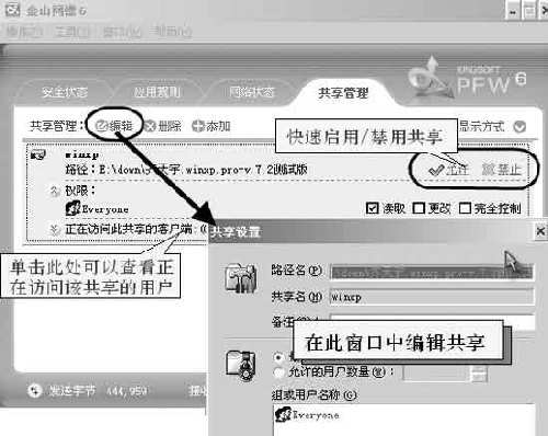 4 果冻提示 大家还可以在“Banned IP Addresses(不信任的IP地址)”选项卡内,将自己想拒绝的用户的IP地址添加进来。 金山网镖 金山网镖提供了局域网共享目录的访问监控功能,它允许用户随时查看本机共享目录的访问情况。通过这一功能,用户可以随时取消不必要的共享目录并中止其他用户对自己的共享目录的访问,尽可能地阻止恶意程序的入侵以及他人的“偷窥”。 在金山网镖的主界面中,点击“共享管理”选项卡,在“共享管理”窗口列表中便会列出当前所有的共享。选择需要编辑的共享,然后在“共享管理”页面上方通过点击“编辑”、“删除”、“添加”等图标,便可对共享文件进行管理。另外,如果你想暂时中止某个文件夹的共享,只需要点击该文件夹右侧的“禁止”即可(图5)。  图5 此外,想要在局域网内能够正常互访,我们还需要做以下设置。在金山网镖的主窗口菜单栏上点击“工具→综合设置→IP设置”,勾选“我的电脑处于局域网中”复选框,点击“确定”按钮使设置生效。<页码:[1] [2] [3] [4] [5] [6] 第5页、共6页 |