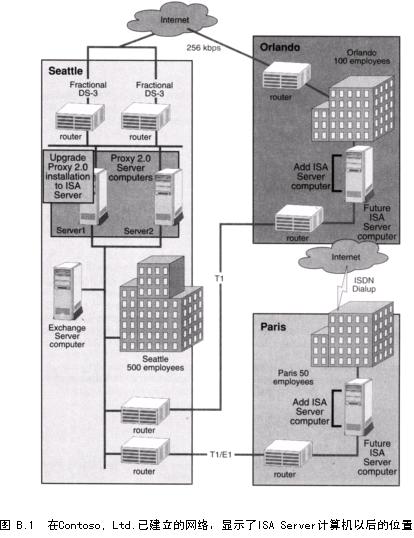 您打算将西雅图公司现有的两台运行Windows NT 4.0 Server和Proxy Server 2.0的计算机升级为ISA Server。您还打算在巴黎和奥兰多两个分公司中配置ISA Server,如图B.1所示。在Proxy Server 2.0环境下的Microsoft Exchange Server可为内部客户端收发Internet邮件。