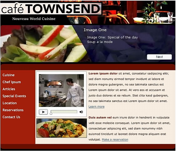 本教程向您提供为 Cafe Townsend(一个需要制作 Web 站点的虚构餐馆)设计的、完整的和符合要求的设计草样。作为 Web 设计人员,您需要对草样进行转换,使之最终形成可以使用的 Web 页面(通常需要其他图形设计人员与 Flash 开发人员的帮助)。