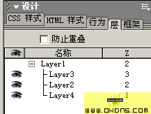 2.这时,我们点击ALT + F9 打开时间轴面板,DW已经为我们添加了默认的时间轴Timeline1,然后,我们选中我们要滑动的图层layer4,在上面点击右键,选择 [添加到时间轴] 这时我们可以在时间轴面板中看到我们刚刚制定的图层layer4,这说明,我们已经添加成功了!