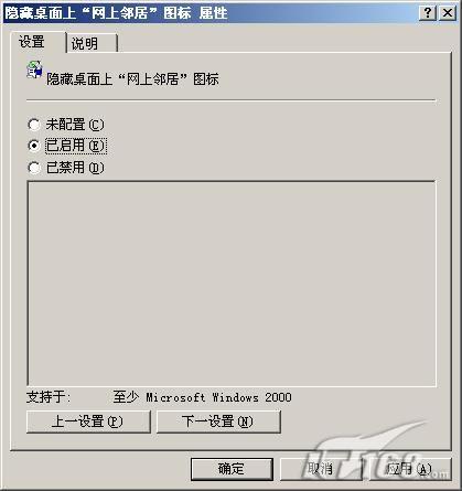 按照前面的方法打开组策略编辑器,然后在左侧选择“用户配置—管理模板—桌面”,再双击右侧的“隐藏桌面上的网上邻居图标”,在打开的窗口中将其设置为“已启用”项(图3),这样通过右击桌面上网上邻居图标的方式打开本地连接这条路就行不通了。
