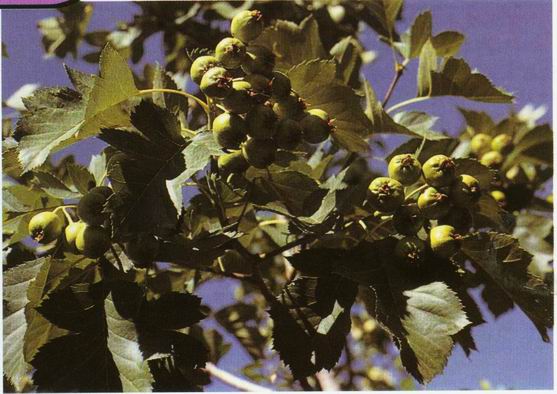形态特征:蔷薇科山碴属灌木或小乔木植物,高3-6米,通常无刺,少数有少量粗壮的刺。小枝紫褐色或红褐色。叶互生,宽卵形或三角状卵形,长5-9厘米,宽4-7厘米,顶端急尖,基部楔形,边缘有锐齿,通常有2-4对裂片,基部1对较深;叶柄长2.5-4厘米。5-6月开花,复伞房花序;花白色,直径12-15毫米;萼筒钟状,裂片三角状卵形或三角状披针形;花瓣近圆形。梨果球形,熟时金*,直径8-10毫米,萼裂片福存。