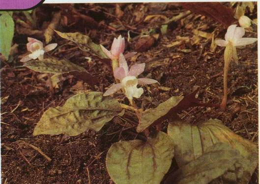 形态特征:兰科独花兰属多年生地生草本植物。假鳞茎具节,淡黄白色,顶生1枚叶。叶具柄,叶片宽卵形或宽椭圆形,长7-11厘米,宽4.5-8厘米,全缘,下面带紫红色; 叶柄长5.5-9.5厘未。3-4月开花,花葶上有2-3枚鞘状退化叶;花单朵顶生,直径5.5-7厘米,常淡紫色,罕为白色;萼片3,长圆状披针形;花瓣倒卵状匙形;唇瓣宽大,3裂,侧裂片斜卵形,直立,围抱蕊柱,中裂肾形,边缘稍皱波,内面唇盘上具5条纵褶片,具紫红色疣点和细点,基部具长约2厘米稍弯曲的距。