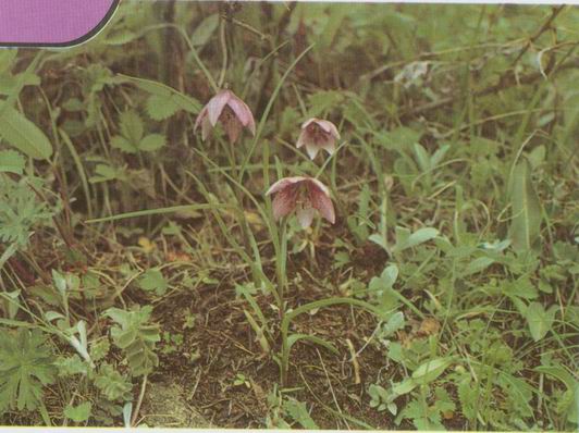 形态特征:百合科百合属多年生草本植物,高10-30厘米。鳞茎长圆形,长2-3.5厘米。茎直立。叶散生,条形,6-11枚,长4-8.5厘米,宽2-4毫米,近基部的2-3枚较短而宽。花1朵,6月开花,花钟形,下垂;花被片淡紫色或紫红色,内侧具深紫色斑点;外轮花被片椭圆形,长2.5-2.7厘米,宽1-1.2厘米;内轮花被片较外轮稍宽,蜜腺两边有流苏状突起;柱头膨大,直径3-4毫米。蒴果长圆形,长2.8-3.5厘米,直径2-2.5厘米,棱带紫色。