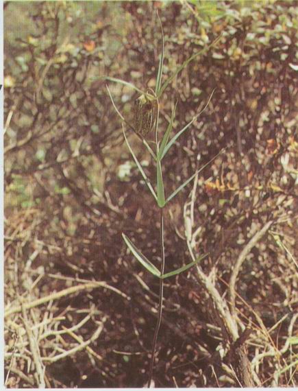 形态特征:百合科贝母属多年生草本植物、高15-50厘米。鳞茎直径1-1·5厘米。叶对生,少3-4枚轮生,条形或条状披针形、长4-12厘米,宽3-5(-10)毫米,顶端常卷曲。花常1朵,5-7月开花,花紫色至黄绿色,通常有小方格、常下垂,蒴果长宽各约1.6厘米。棱上有宽1-1.5毫米的狭翅。