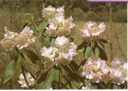 形态特征:杜鹃花科杜鹃花属灌木或小乔木植物,高2-7.5米。叶薄革质,长圆状卵形或长圆状椭圆形,长6-11厘米,宽3-5厘米,顶端圆形,具短尖头,基部圆形或截形,无毛,叶面绿色,具光泽,叶背苍白色;叶柄长2-3.5厘米。5-6月开花,花序总状伞形,约10朵花,花梗长2-3厘米;花萼7裂,长1.5-2.5毫米,裂片阔卵形,边缘具红色腺体;花冠漏斗状钟形,白色或带粉红色,长3.5-4厘米,7裂,裂片长1.8厘米,宽2厘米,顶端微凹;雄蕊14,不等长,长2-3厘米,花丝无毛。