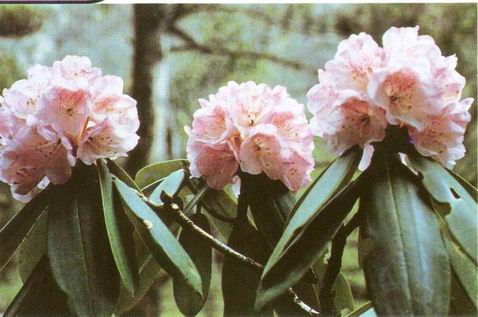 形态特征: 杜鹃花科杜鹃花属小乔木植物,高1-2·5米。叶互生,革质,长圆状倒卵形或圆状披针形,长6-9厘米,宽2-3.5厘米,背面肉桂色至褐色,毛被厚,绵毛状。5用开花,花序总状伞形,8-13朵花;花梗长约1.5厘米 花萼小,长约1.5毫米,5裂,无毛;花冠漏斗状钟形,长3.5-4厘米,粉红色,具多数紫色细点,裂片5,长约1.5厘米,宽约2厘米,顶端圆形或微凹。果长约1.5厘米,直立,无毛。